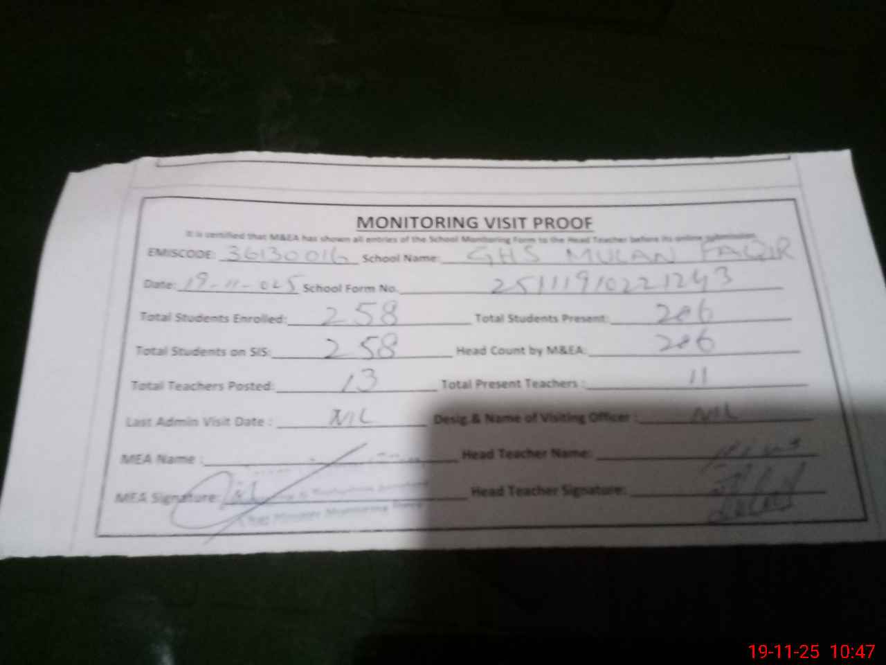 | Attendance Register | Head Teacher | MEA with School | Visit Proof |