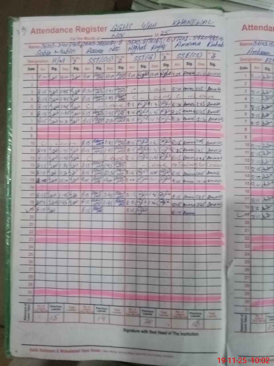 | CNIC | Full Name | Designation | R/C | Absence During Last Calender Month |