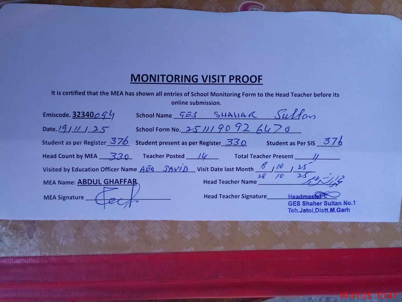 | Attendance Register | Head Teacher | MEA with School | Visit Proof |