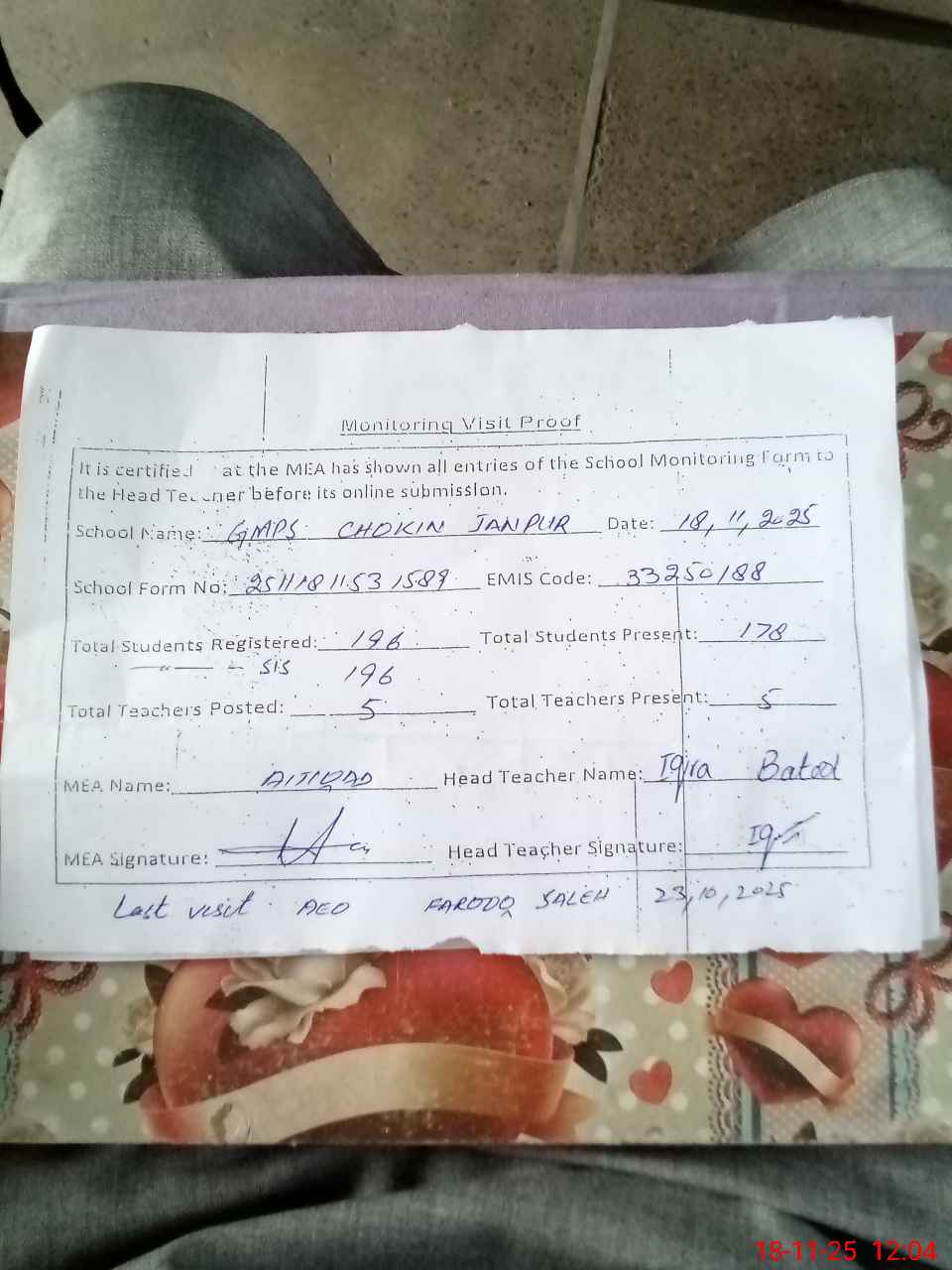 | EMIS Code: 33250188 | Name of School: GMPS CHOKIN JAN PUR | |||
