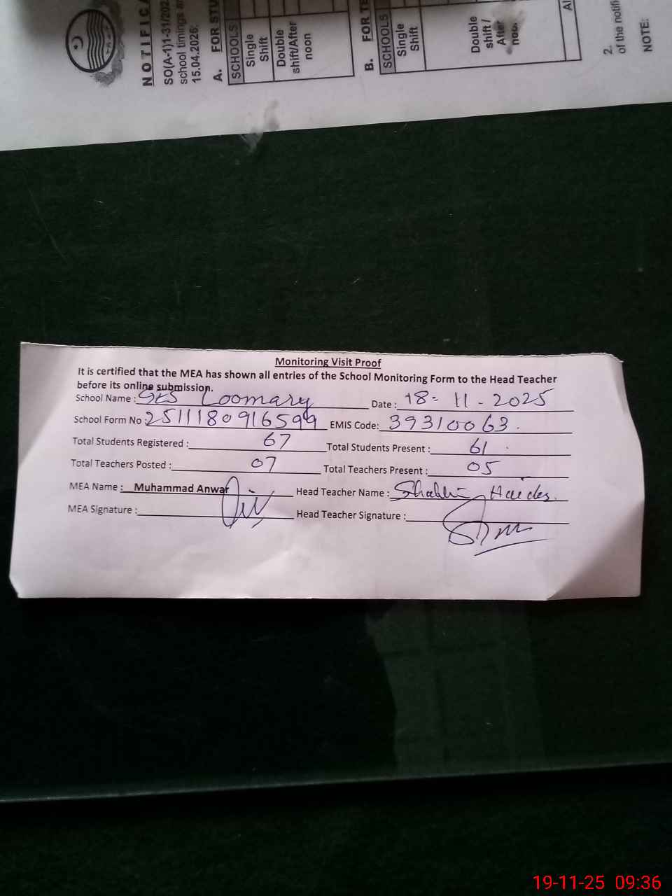 | Certified that this School was Inspected by the Undersigned MEA/DMO Today and the Information Stated Above is as Per Record. | |||||