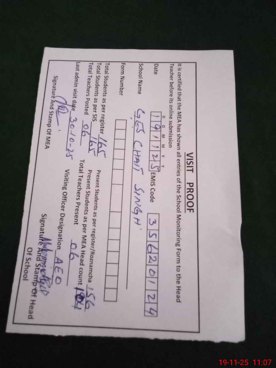 | Attendance Register | Head Teacher | MEA with School | Visit Proof |