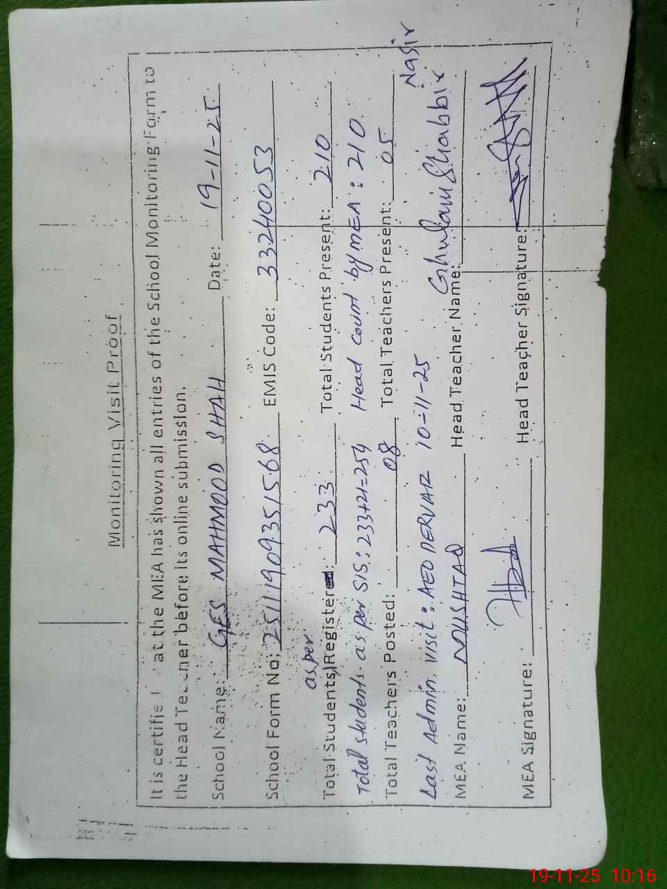 | Attendance Register | Head Teacher | MEA with School | Visit Proof |