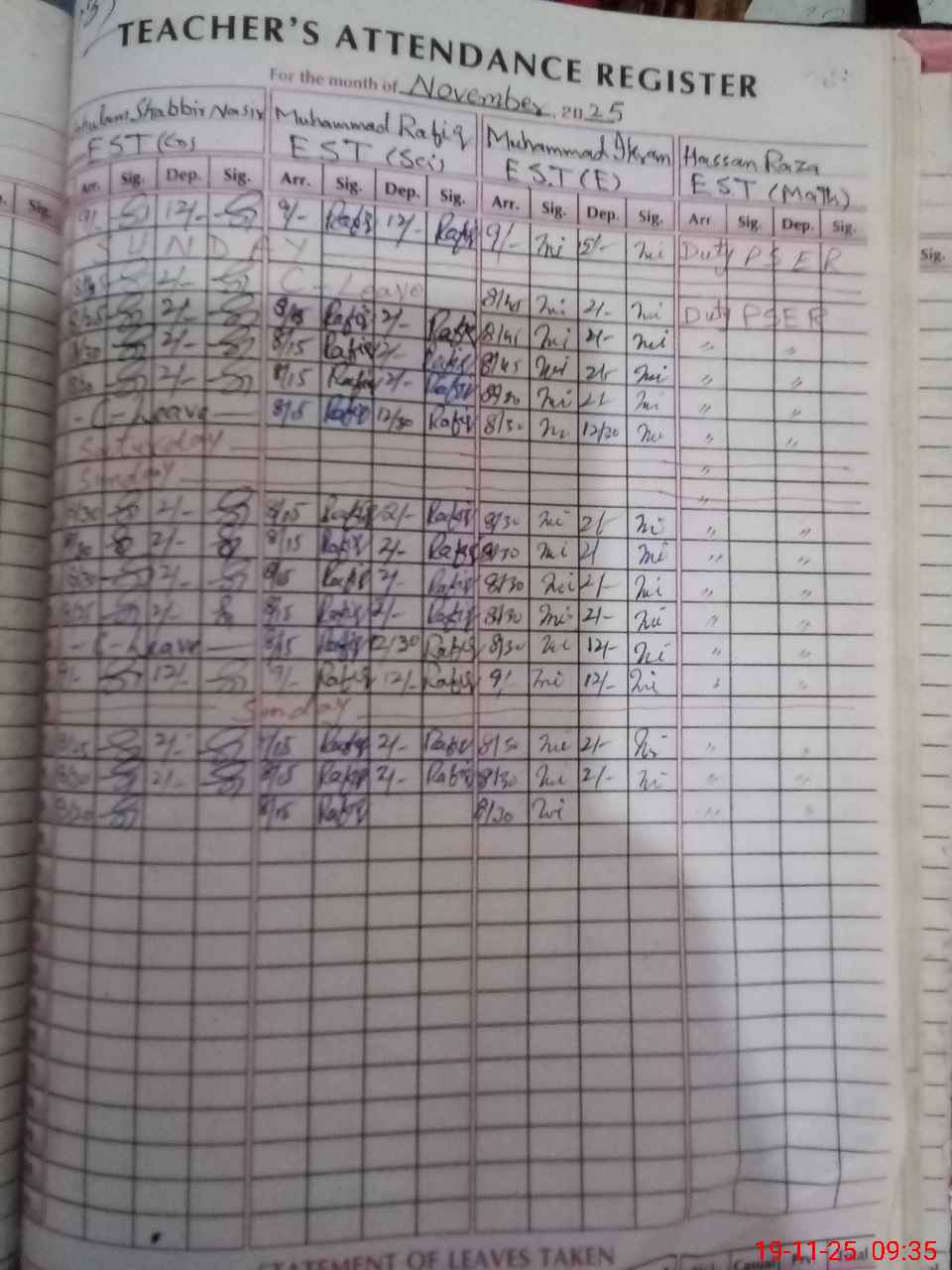 | Leave | Duty | Absent | Maternity | Medical | Ex- Pak |