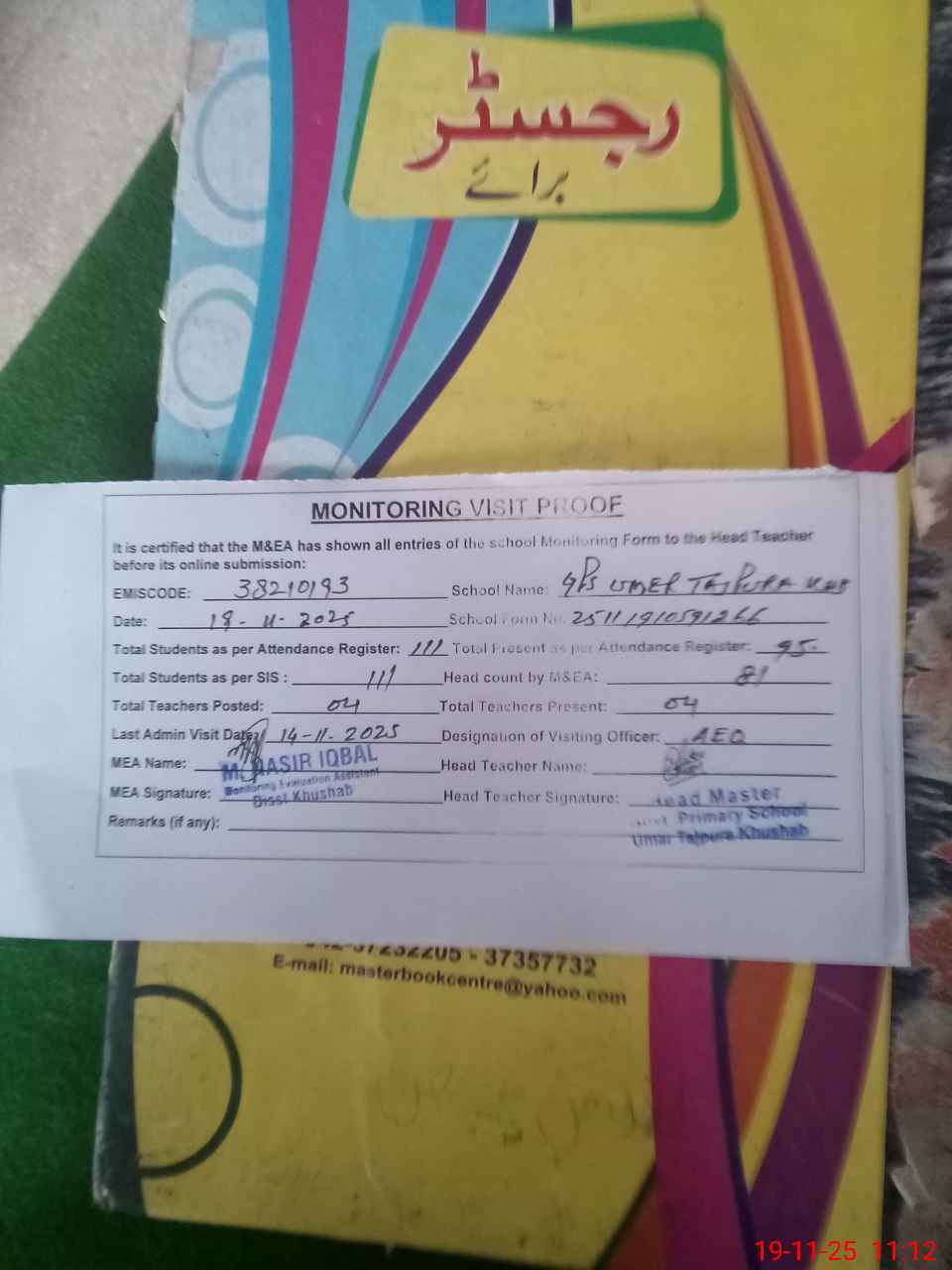 | Attendance Register | Head Teacher | MEA with School | Visit Proof |