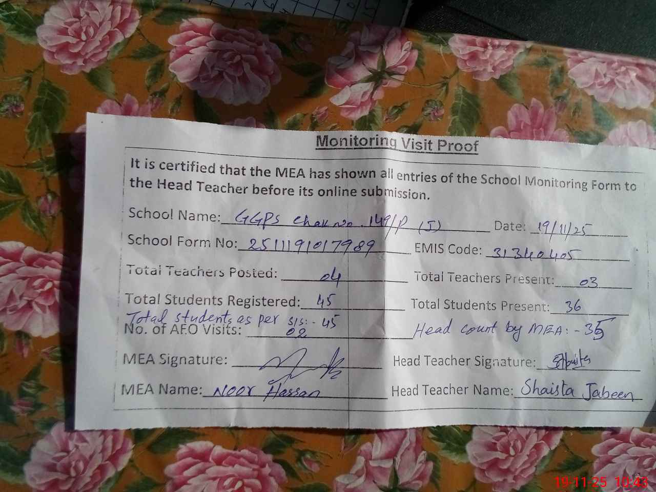 | Attendance Register | Head Teacher | MEA with School | Visit Proof |
