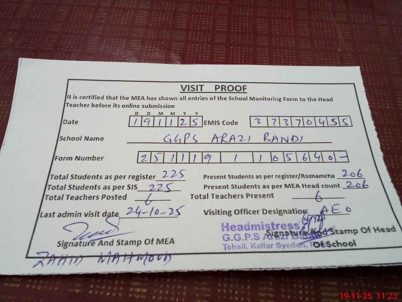 | Attendance Register | Head Teacher | MEA with School | Visit Proof |