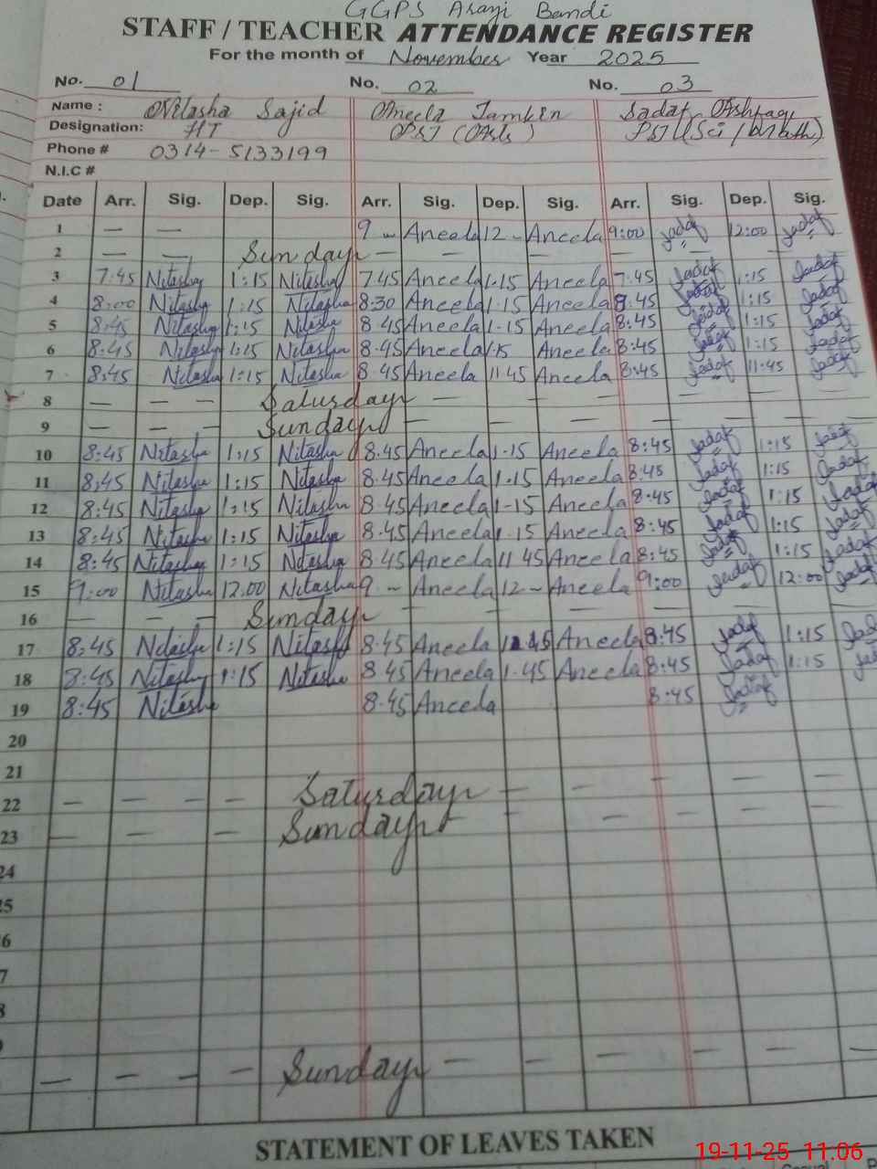 | Name: Ni**** Sa**** Designation: (School Headmaster's/Headmistress's) PST Phone/Cell Number: 03**** |