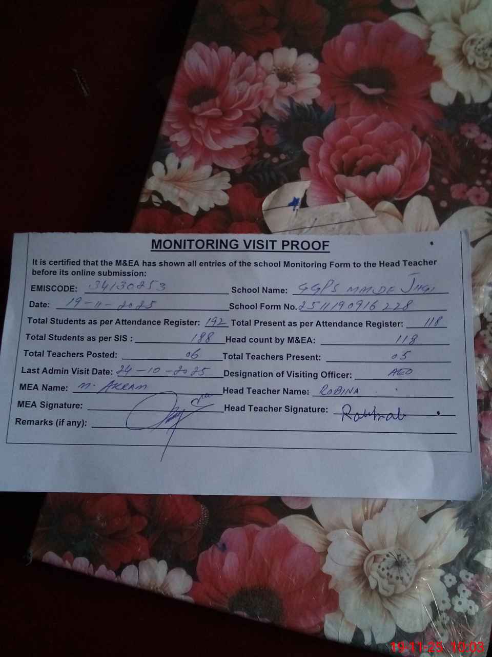 | Attendance Register | Head Teacher | MEA with School | Visit Proof |