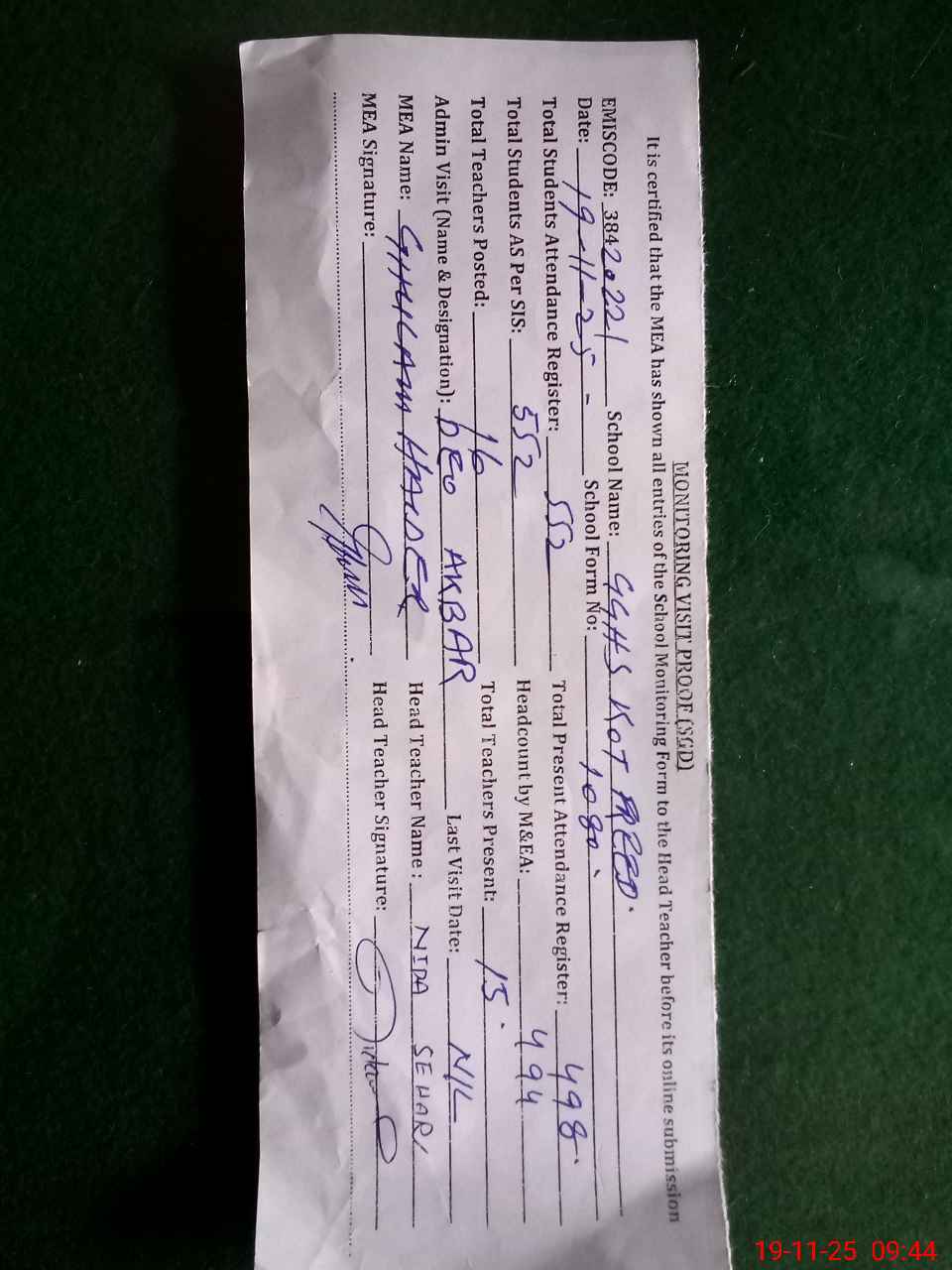 | Certified that this School was Inspected by the Undersigned MEA/DMO Today and the Information Stated Above is as Per Record. | |||||