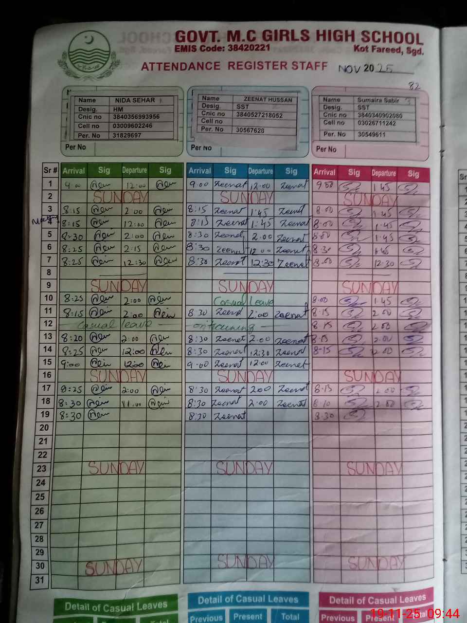 | CNIC | Full Name | Designation | R/C | Absence during last cal. month |