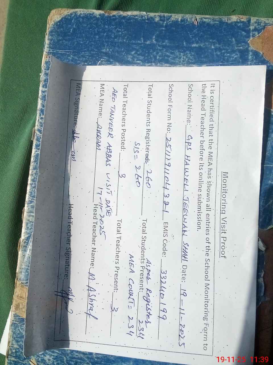 | Attendance Register | Head Teacher | MEA with School | Visit Proof |