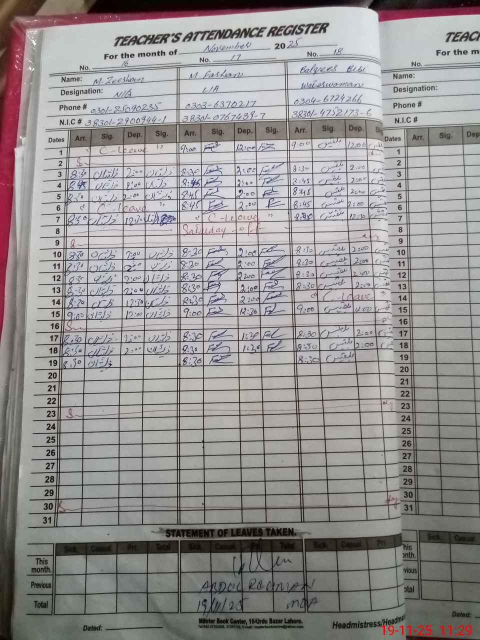 | CNIC | Full Name | Designation | R/C | Absence During Last Calender Month |