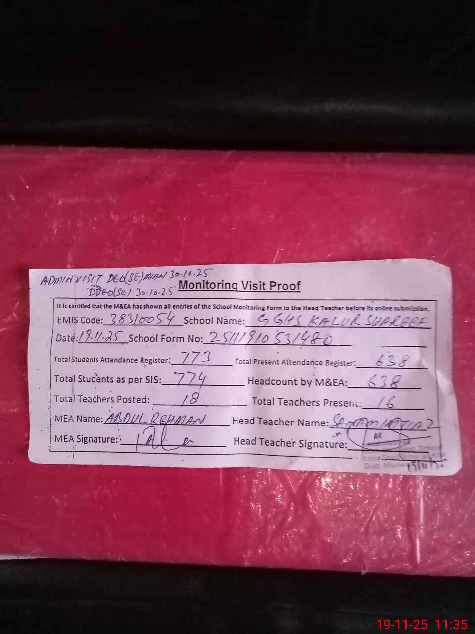 | Attendance Register | Head Teacher | MEA with School | Visit Proof |