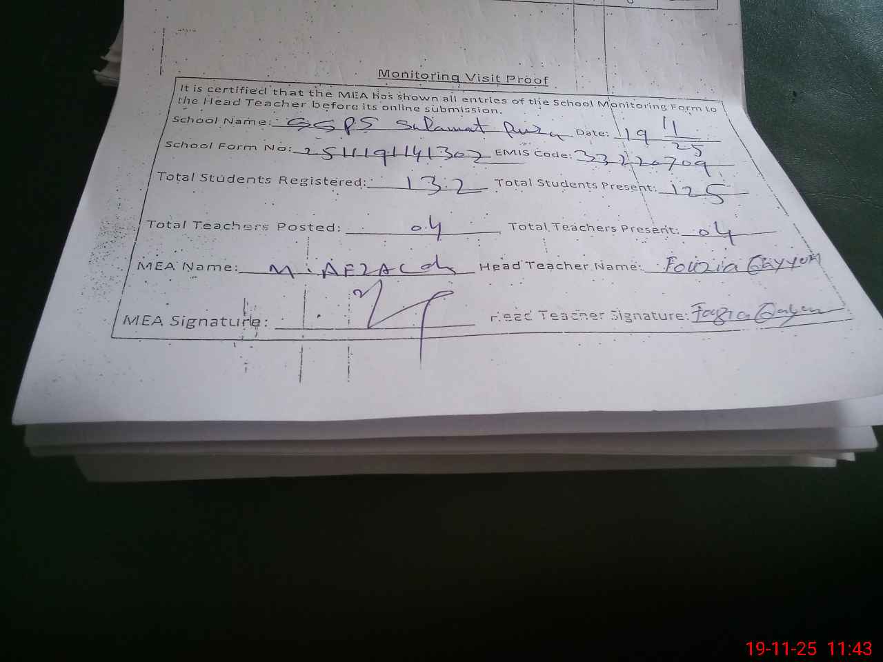 | Attendance Register | Head Teacher | MEA with School | Visit Proof |