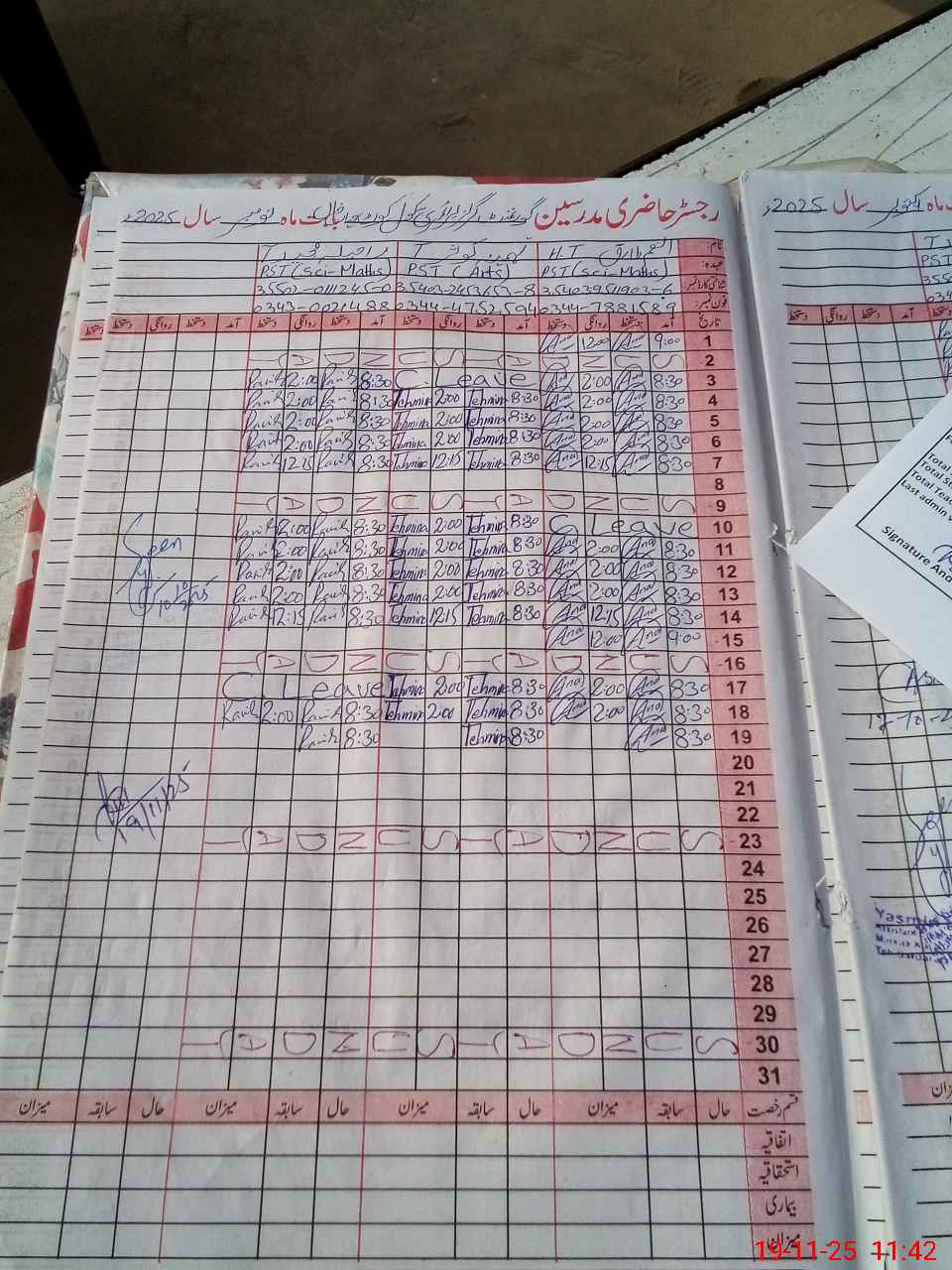 | CNIC | Full Name | Designation | R/C | Absence during last cal. month |
