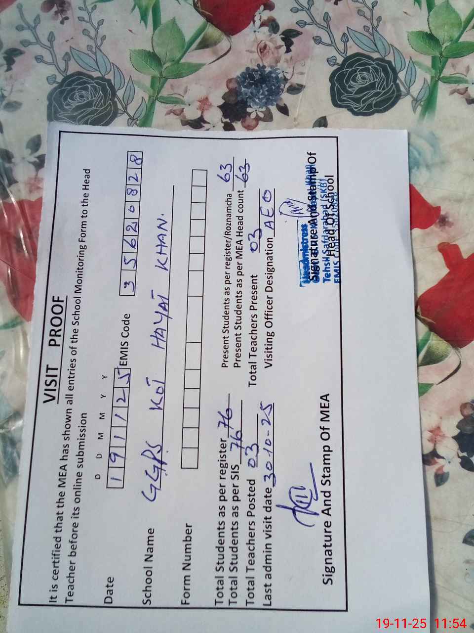 | Certified that this School was Inspected by the Undersigned MEA/DMO Today and the Information Stated Above is as Per Record. | |||||