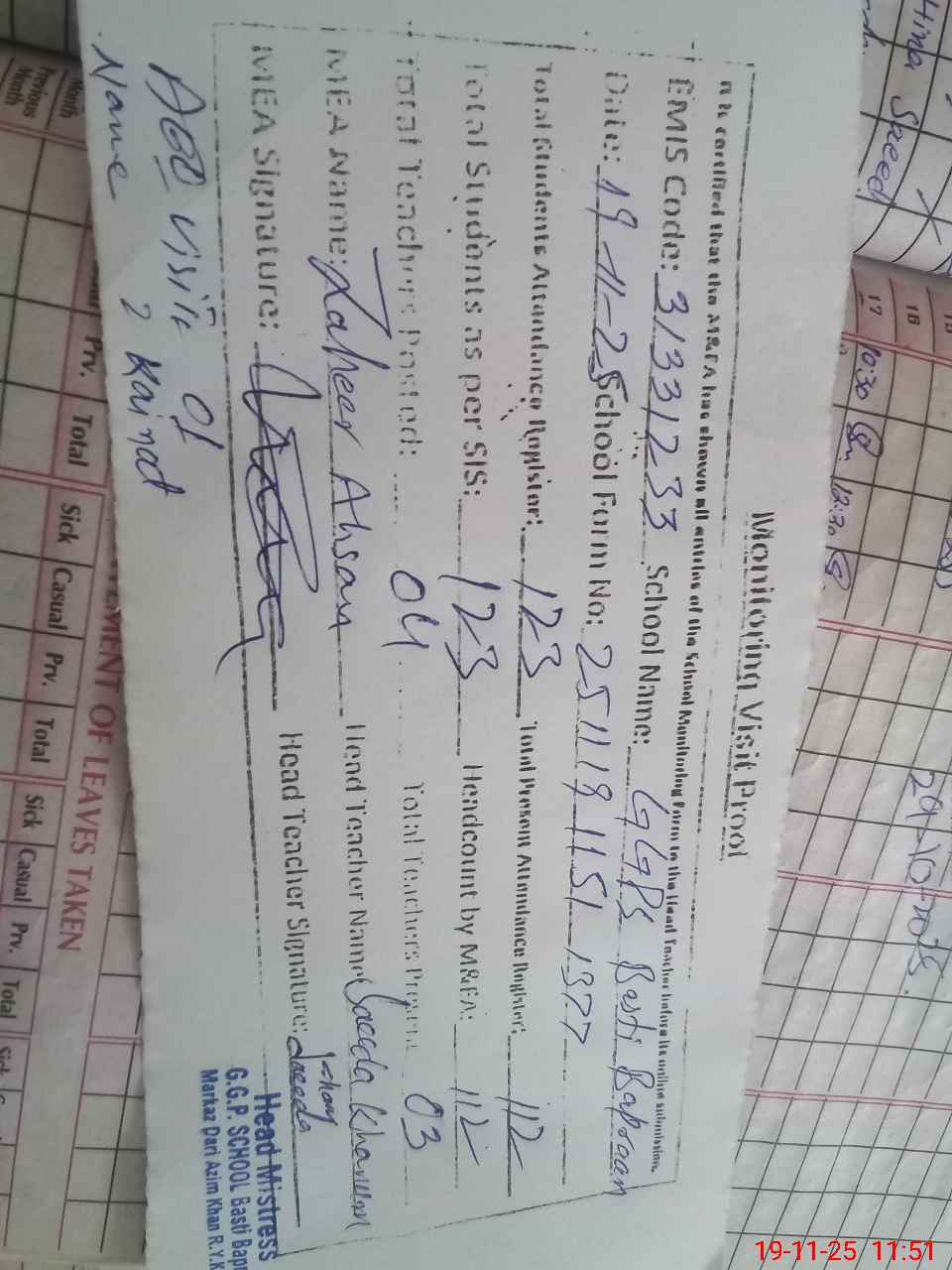 | Attendance Register | Head Teacher | MEA with School | Visit Proof |