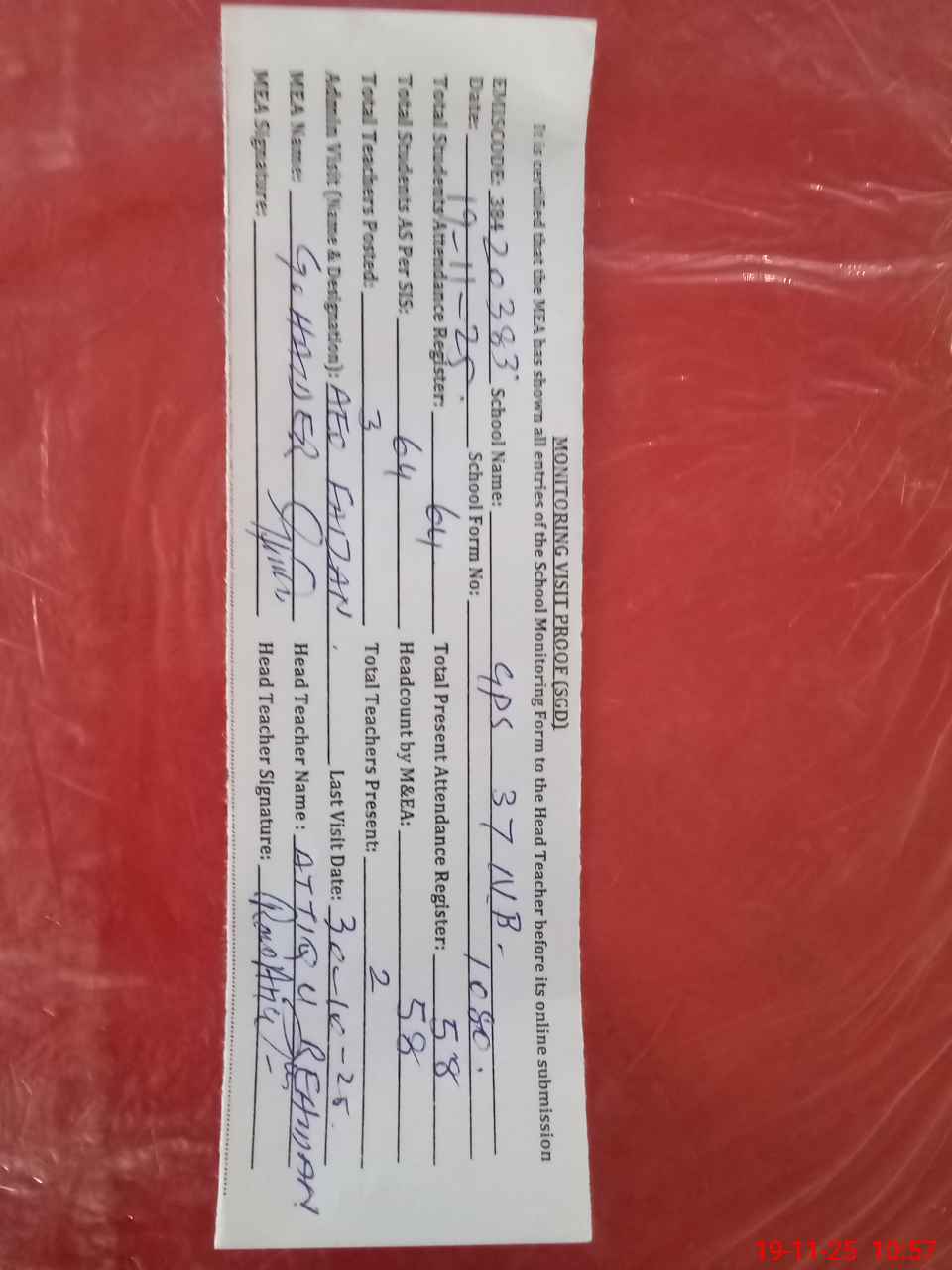| Attendance Register | Head Teacher | MEA with School | Visit Proof |
