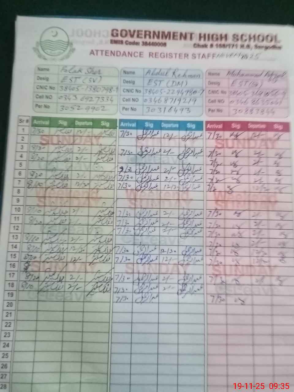 | CNIC | Full Name | Designation | R/C | Absence during last cal. month |