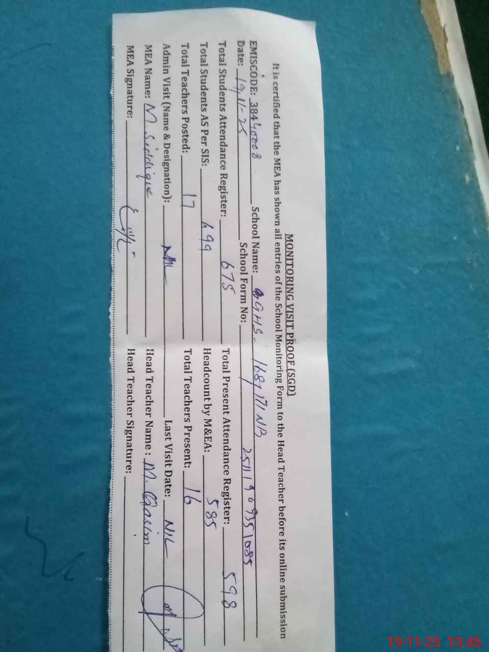 | Attendance Register | Head Teacher | MEA with School | Visit Proof |