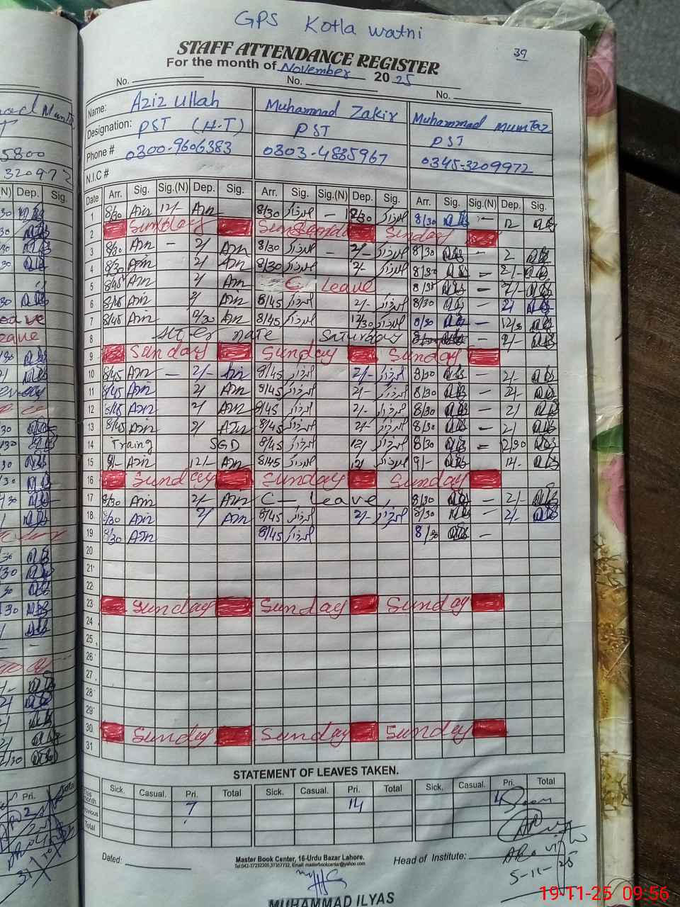 | CNIC | Full Name | Designation | R/C | Absence During Last Calender Month |