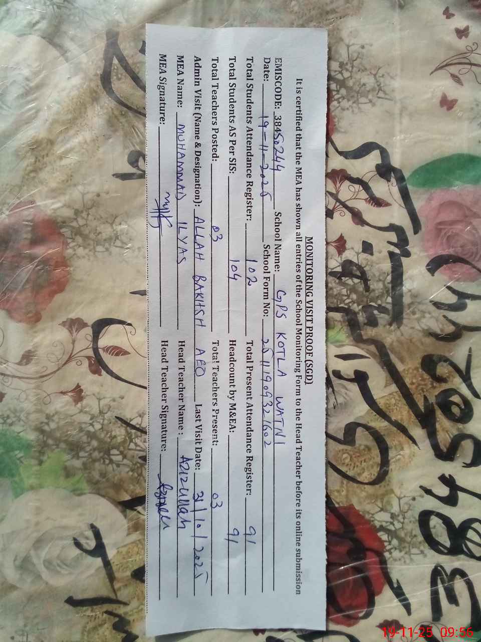 | Attendance Register | Head Teacher | MEA with School | Visit Proof |
