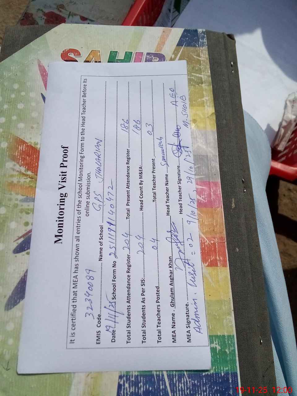 | Attendance Register | Head Teacher | MEA with School | Visit Proof |
