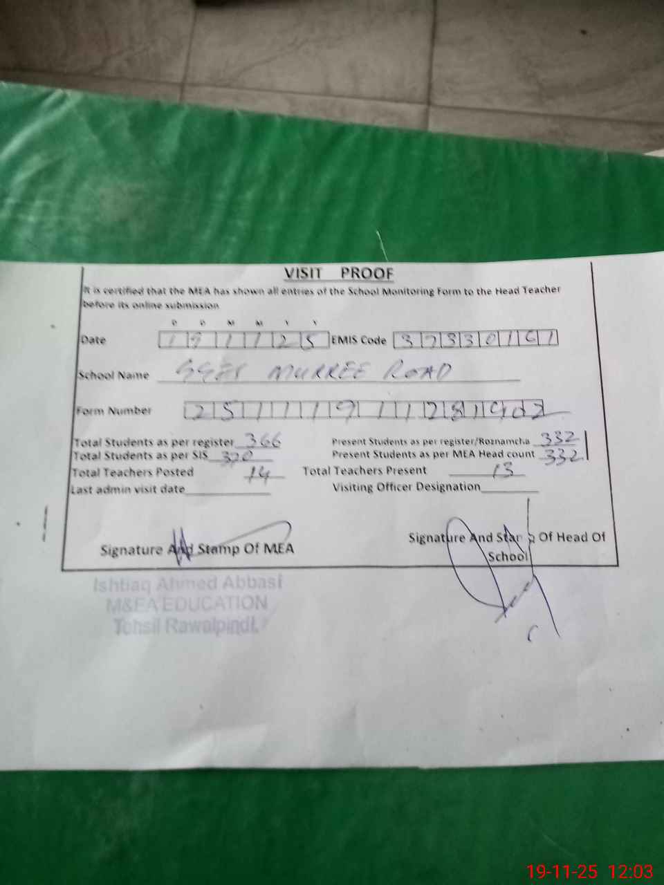 | Attendance Register | Head Teacher | MEA with School | Visit Proof |