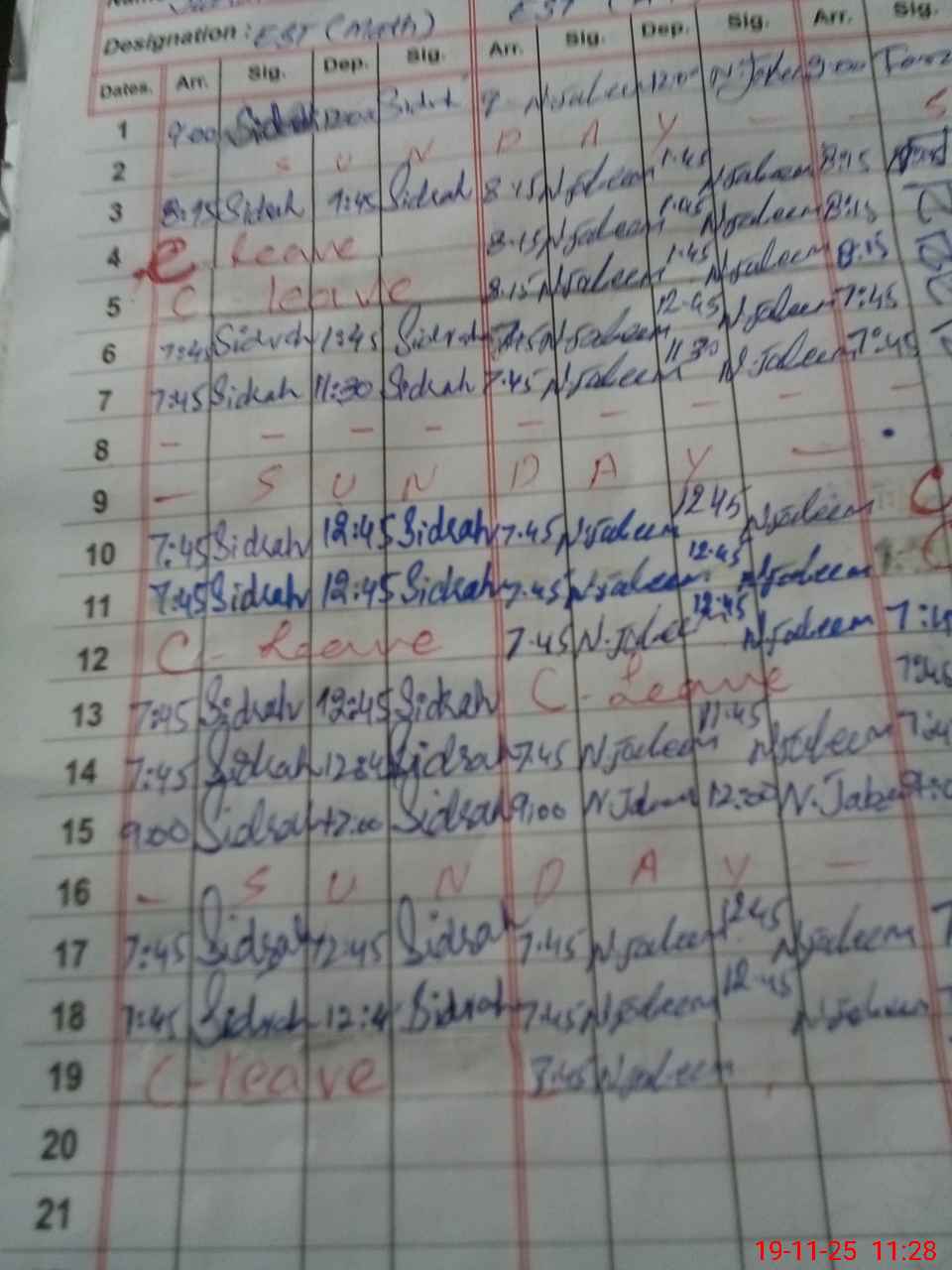 | CNIC | Full Name | Designation | R/C | Absence During Last Calender Month |