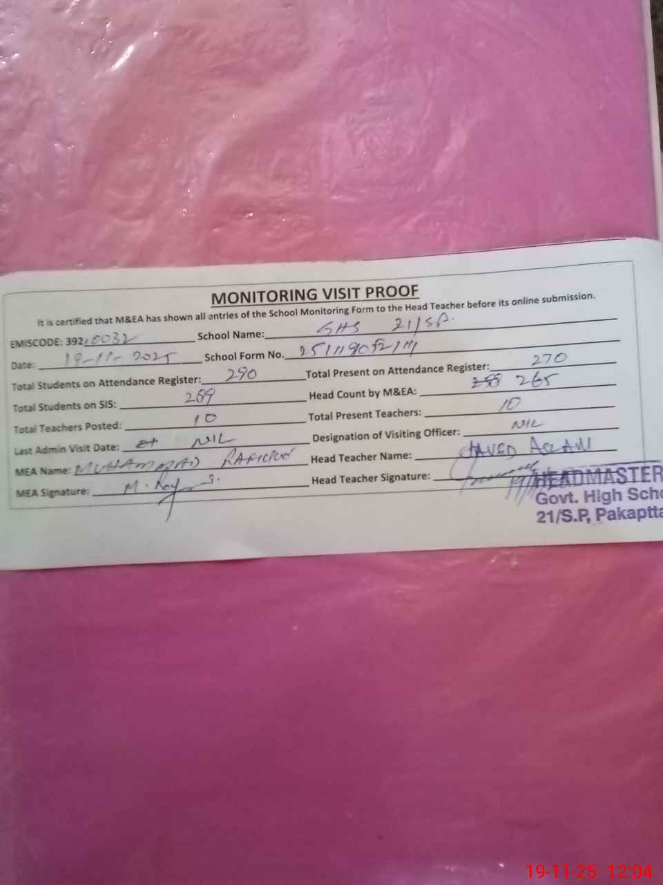 | EMIS Code: 39210032 | Name of School: GHS CHAK NO. 21/SP | |||