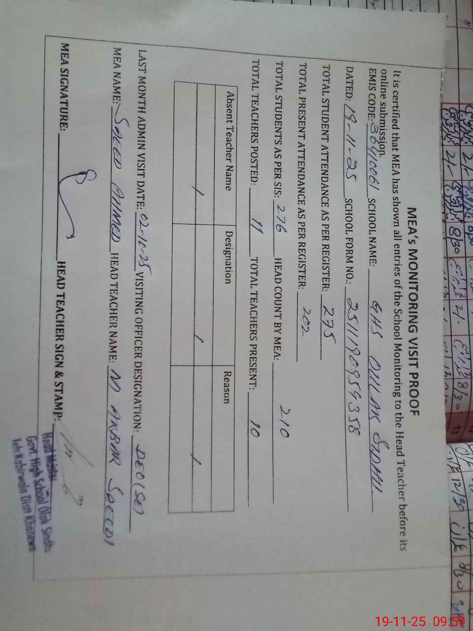 | Certified that this School was Inspected by the Undersigned MEA/DMO Today and the Information Stated Above is as Per Record. | |||||
