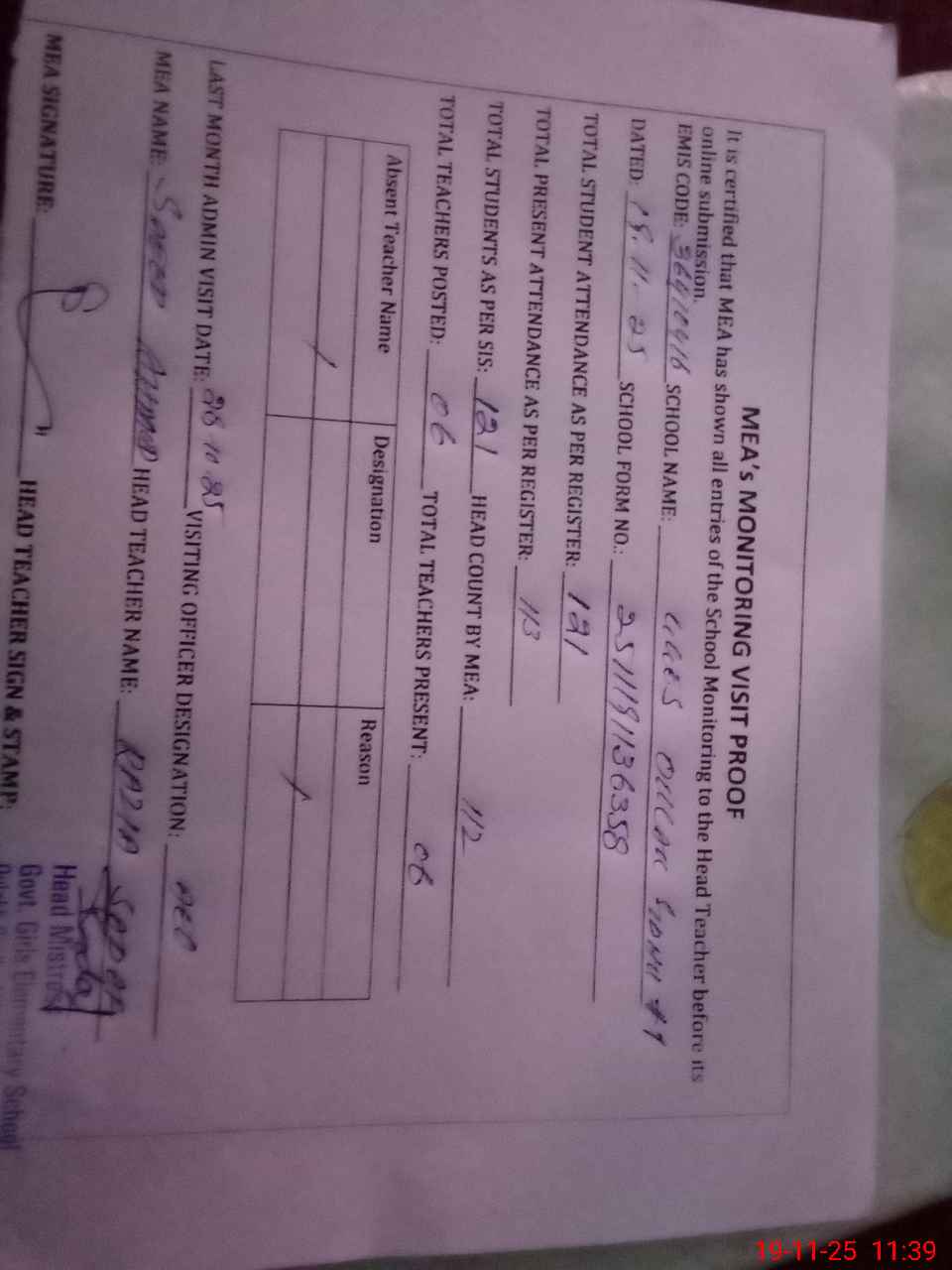 | Attendance Register | Head Teacher | MEA with School | Visit Proof |