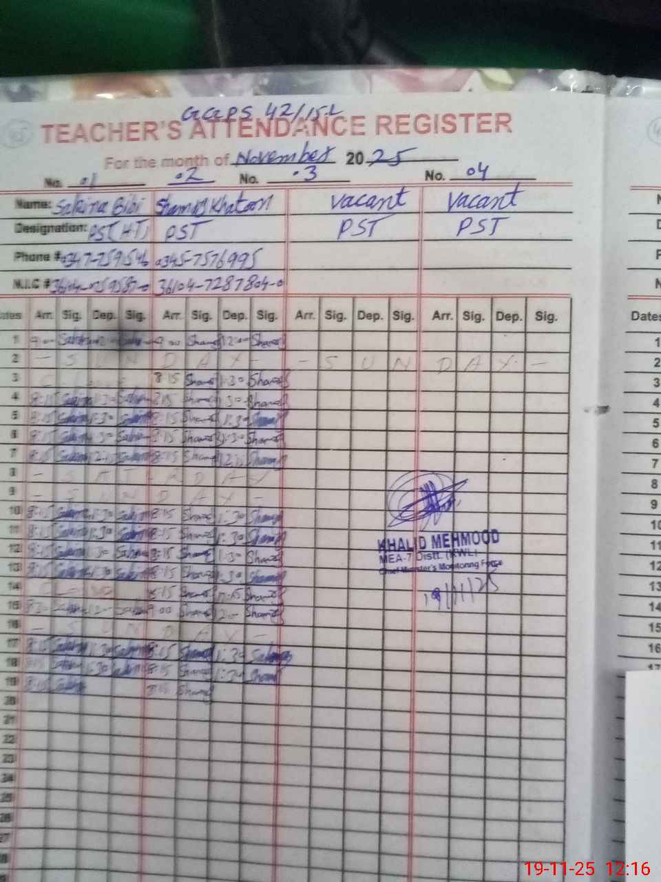 | Name: Sa**** Bi**** Designation: (School Headmaster's/Headmistress's) PST Phone/Cell Number: 03**** |