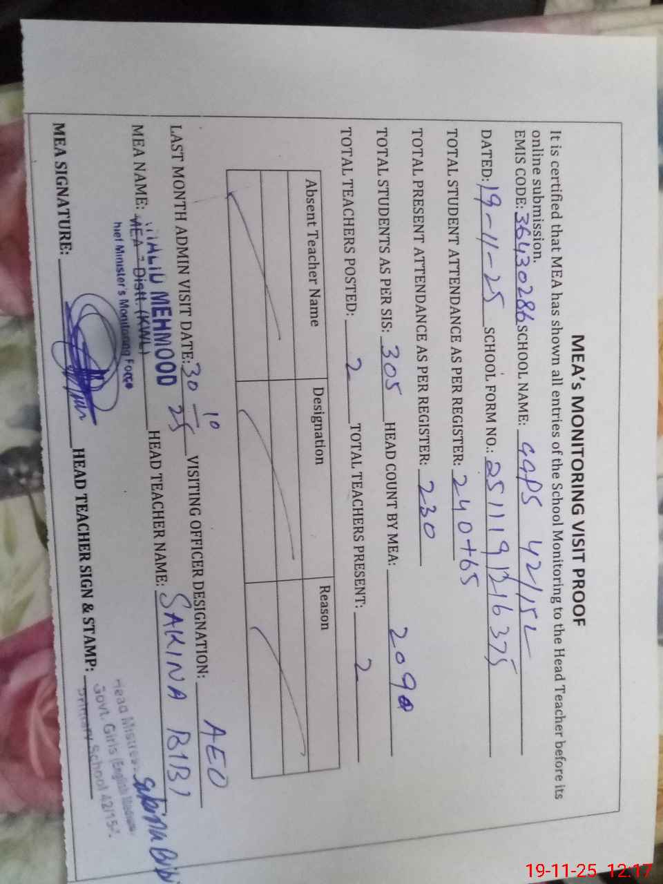 | Attendance Register | Head Teacher | MEA with School | Visit Proof |