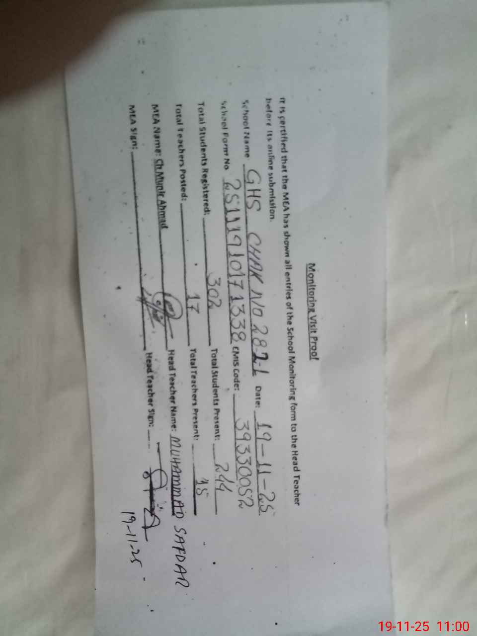 | EMIS Code: 39330052 | Name of School: GHS CHAK NO.28/2-L OKARA | |||