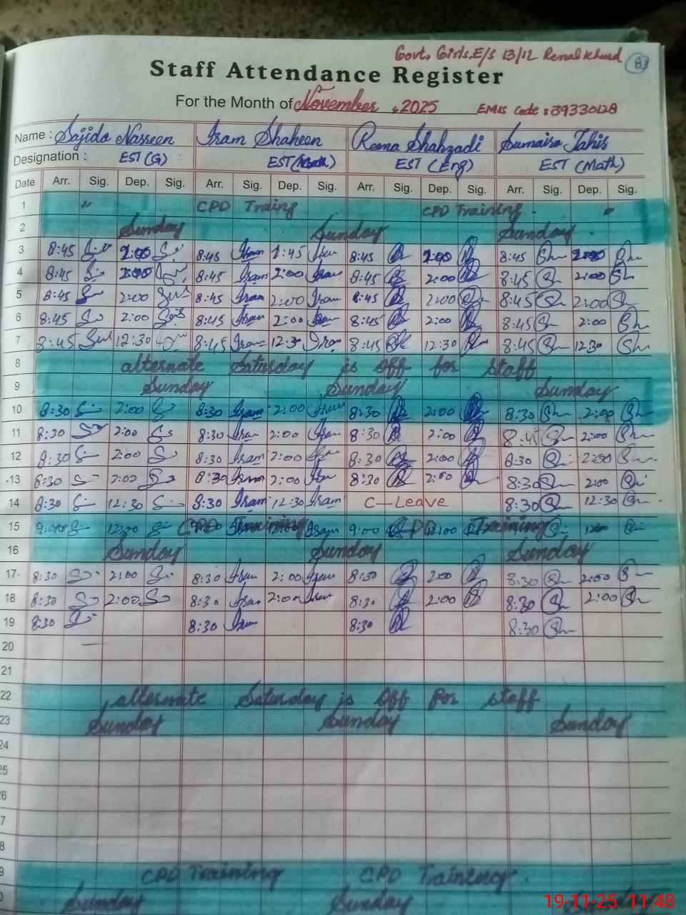 | CNIC | Full Name | Designation | R/C | Absence during last cal. month |