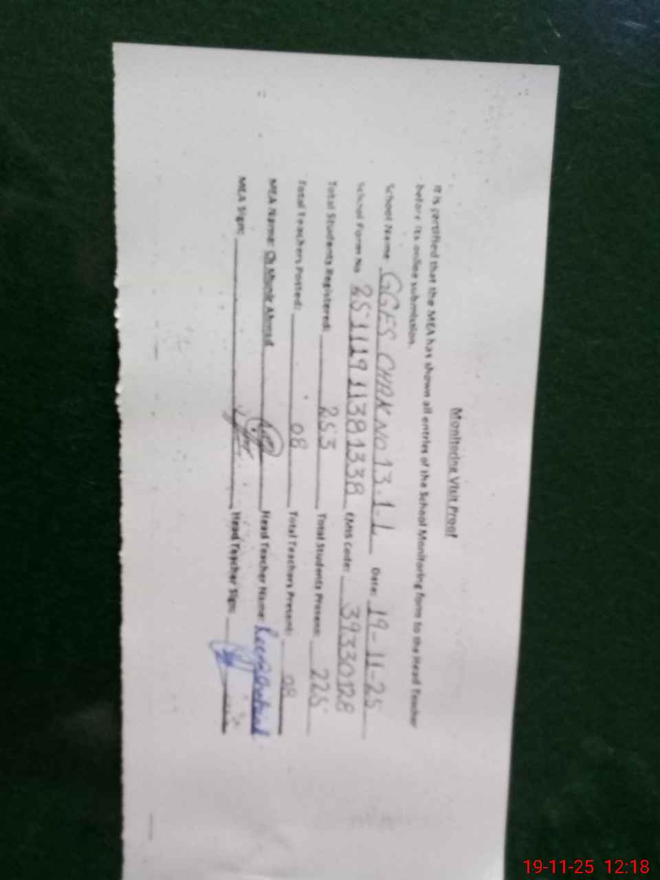 | Attendance Register | Head Teacher | MEA with School | Visit Proof |