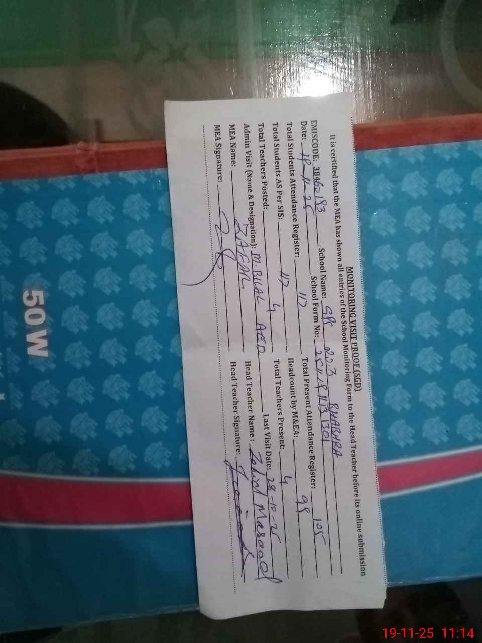 | Attendance Register | Head Teacher | MEA with School | Visit Proof |