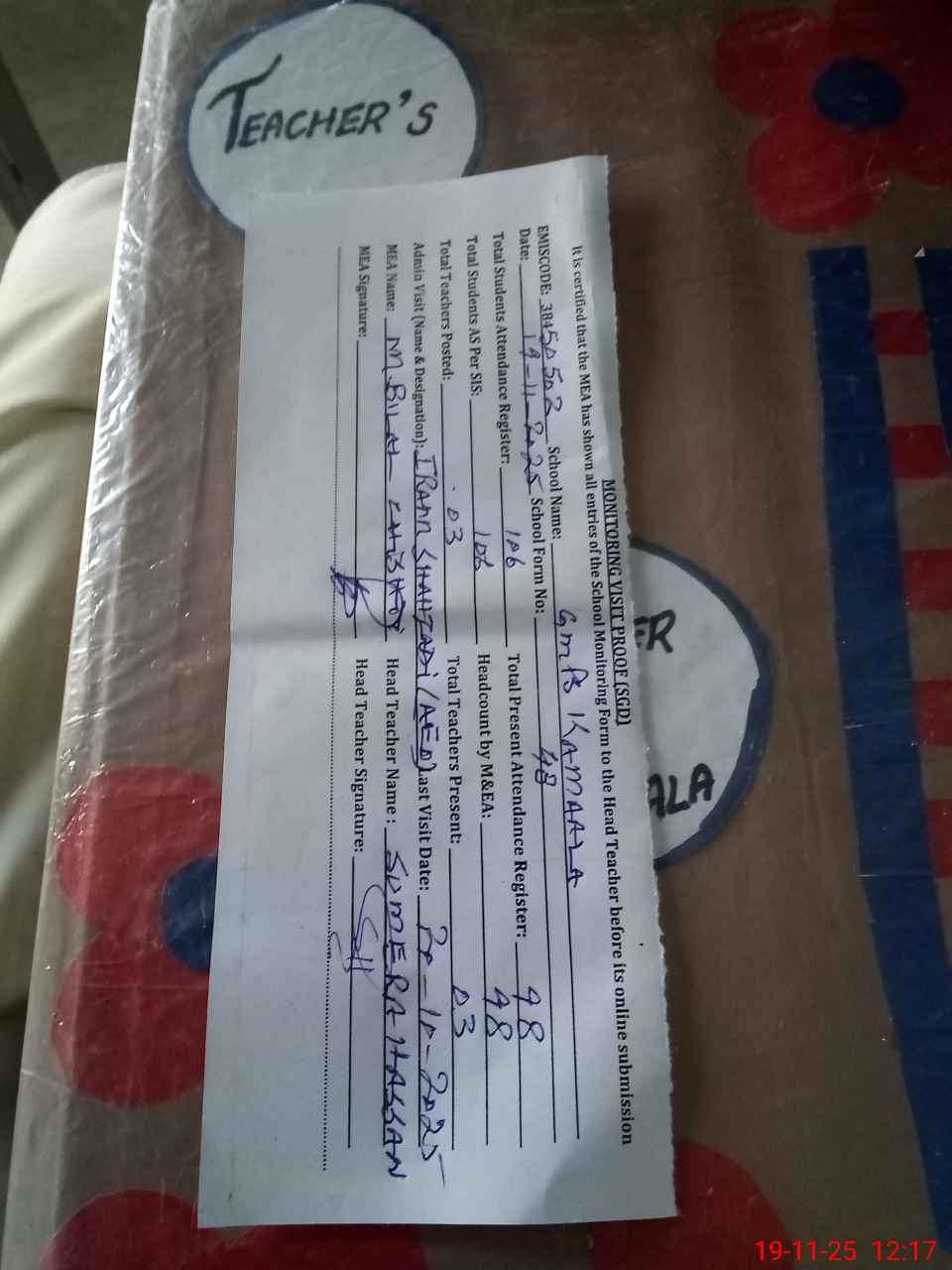 | Attendance Register | Head Teacher | MEA with School | Visit Proof |