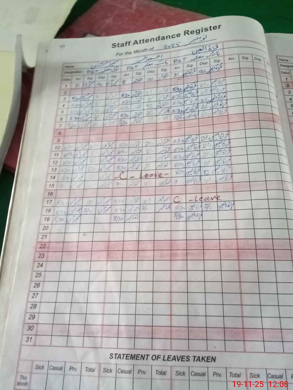 | CNIC | Full Name | Designation | R/C | Absence During Last Calender Month |