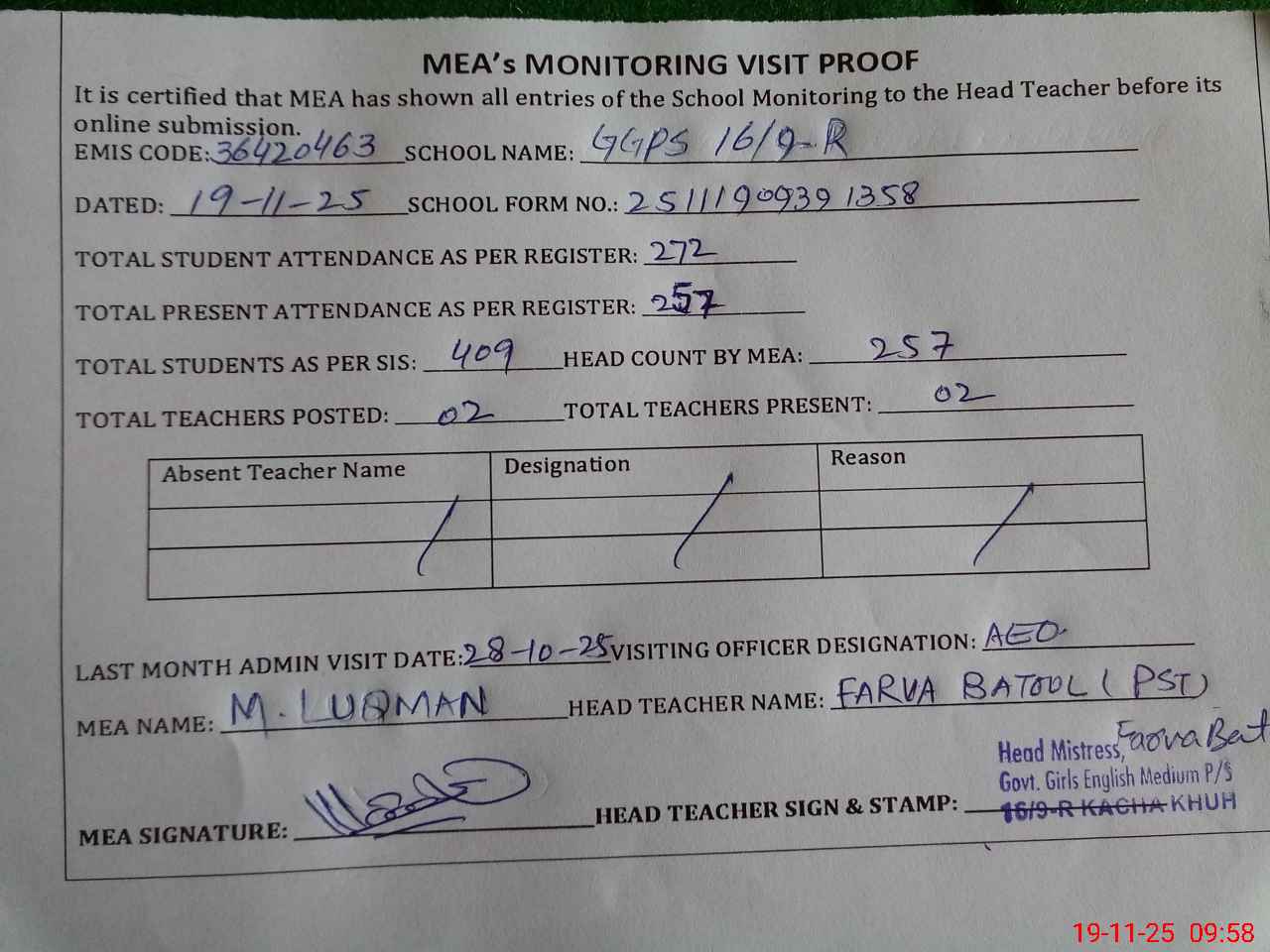 | EMIS Code: 36420463 | Name of School: GGPS 16/9-R, KACHA KHUH | |||