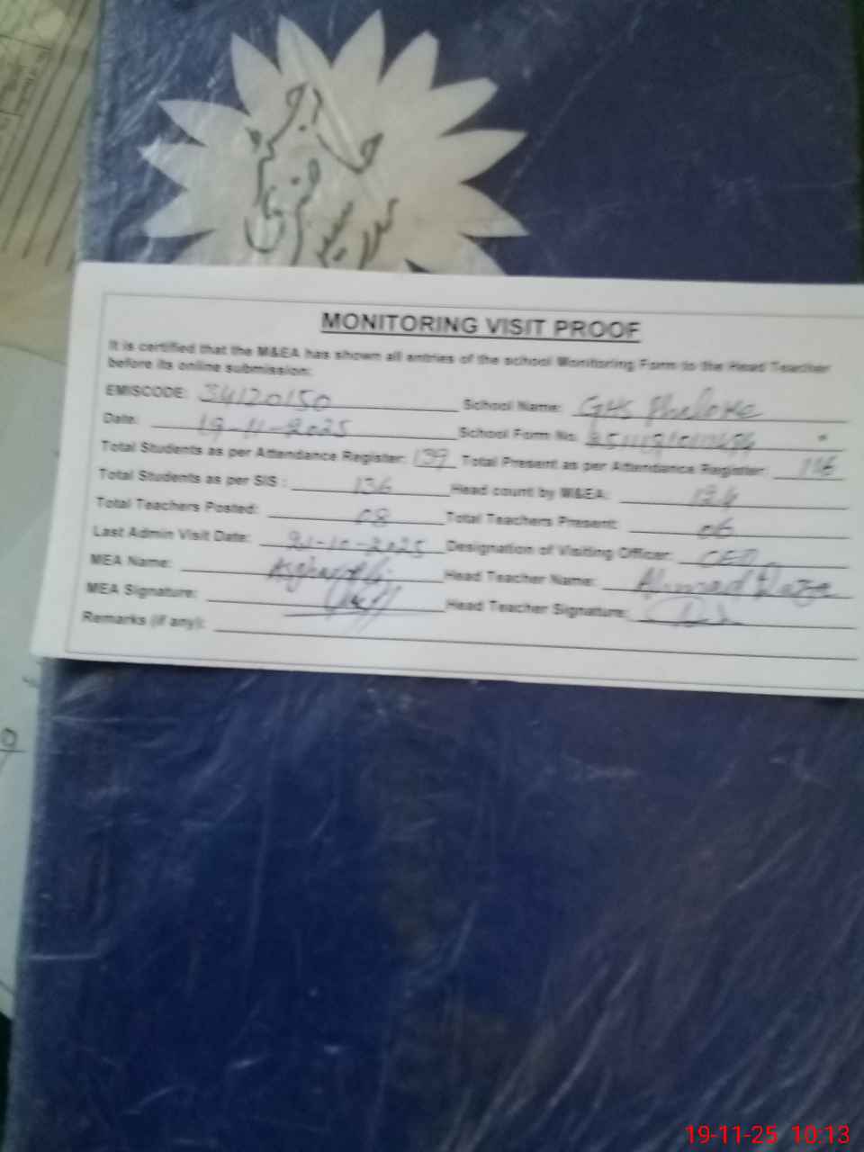 | Attendance Register | Head Teacher | MEA with School | Visit Proof |