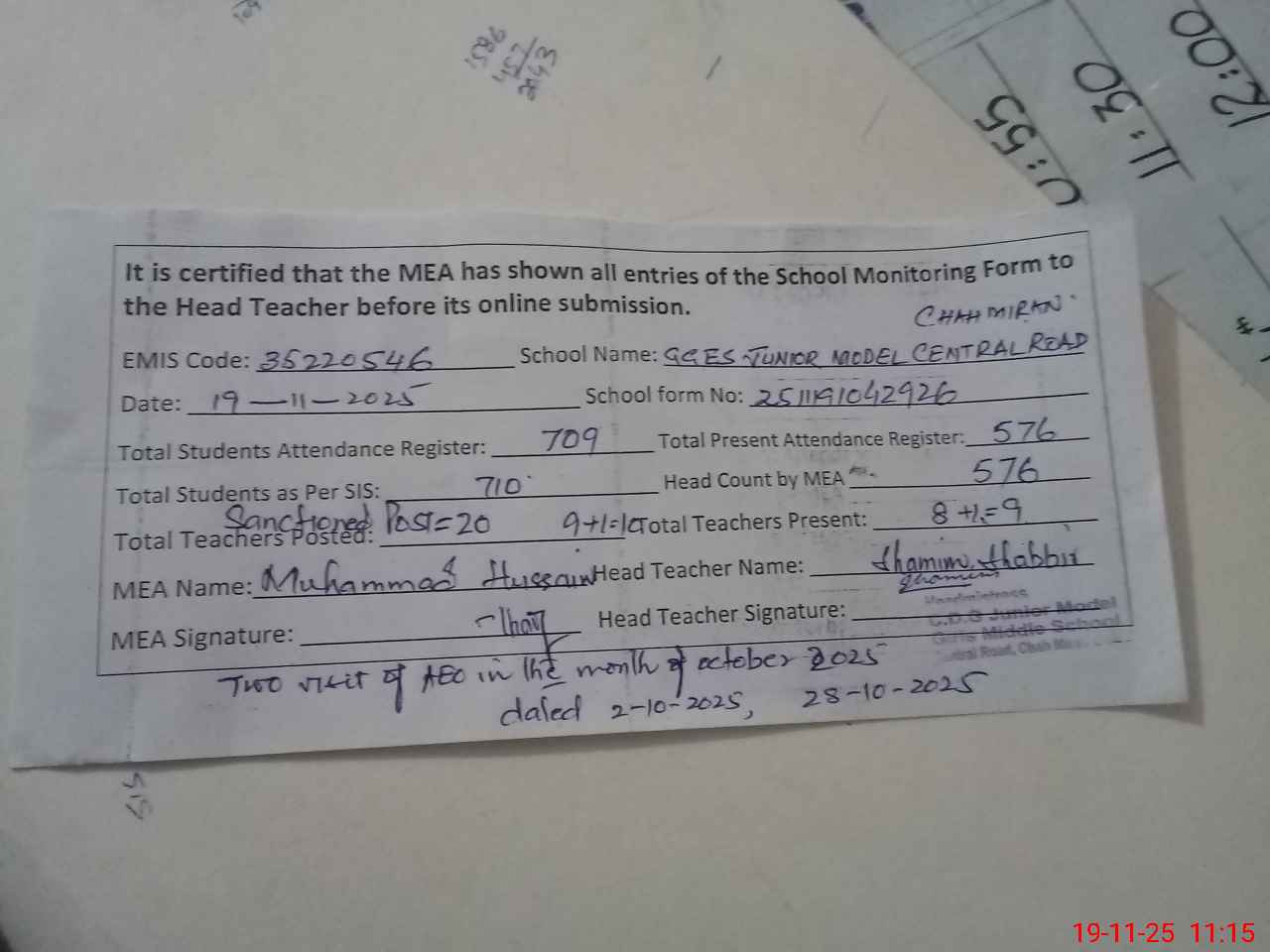 | EMIS Code: 35220546 | Name of School: GGES JUNIOR MODEL CENTRAL ROAD CHAH MIRAN (EX-MCL) | |||