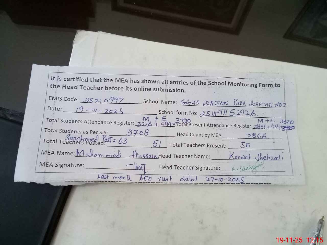 | Remarks (Use Separate Page if Required): 1 AEO visited the school in the month of October 2025 dated 27th October 2025 | |||||