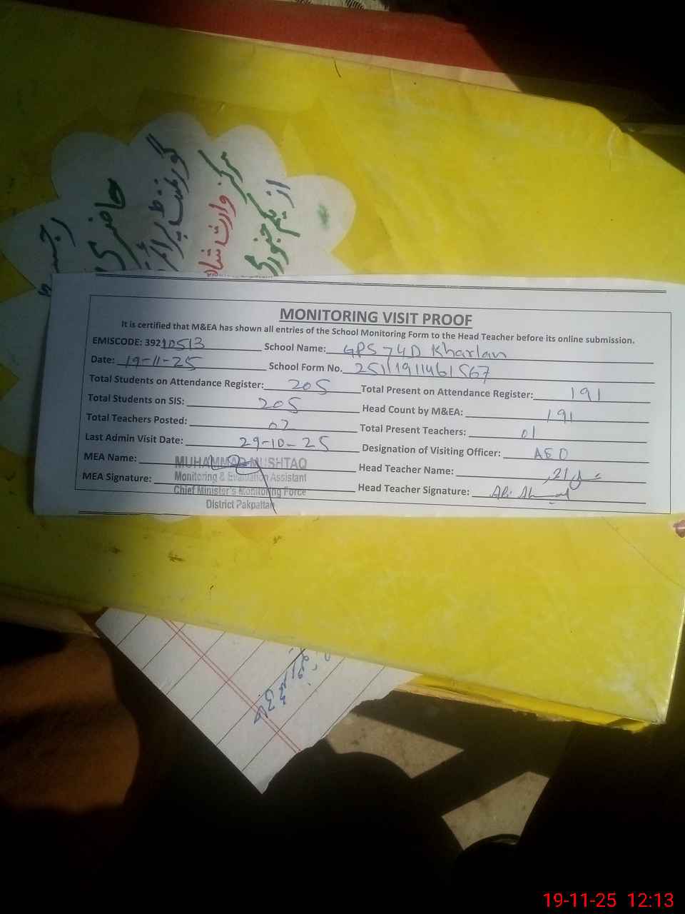 | Attendance Register | Head Teacher | MEA with School | Visit Proof |
