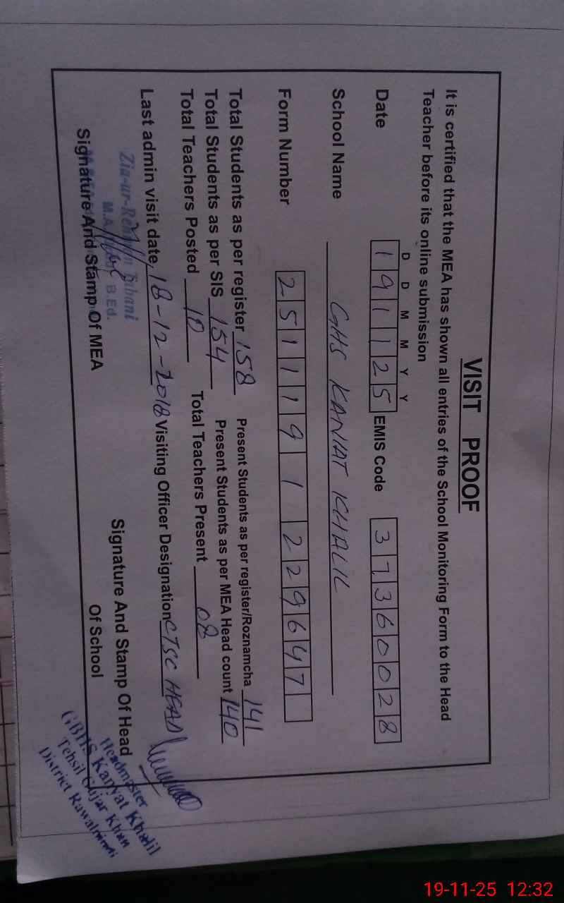 | EMIS Code: 37360028 | Name of School: GHS KANIAT KHALIL | |||