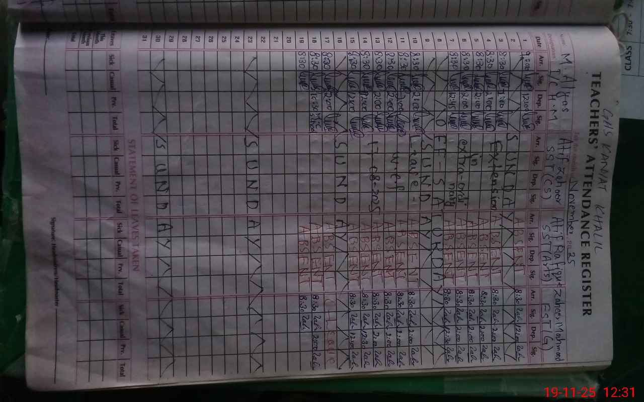 | Remarks (Use Separate Page if Required): Teacher Atif Rafique sst ABSENTED himself on and off since last five years he was reinstated by CEO edu on 10 Jan 2024 after that he continued his absent practices and he carries his Unauthorized ABSENCE from 22 sep 2025 to uptill now According to SOP considered as Unauthorized ABSENT Teacher Atif Zahoor sst cs was on extraordinary leave for one year wef 15 Aug 2024 to 16 Aug 2025 now shown on extension in extraordinary leave but approved leave record is not available so according to SOP considered as Unauthorized ABSENT As I am personally informed by villagers that Mr Atif Zahoor flown Abroad and he is not physically present in Pakistan authority may investigate this issue and provide computer science teacher to this school for smooth conductio of teaching process | |||||