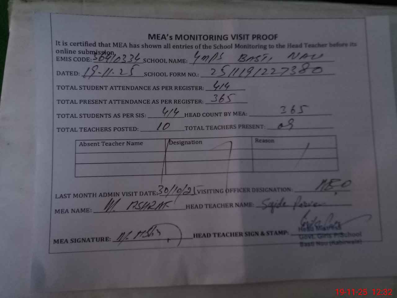 | Attendance Register | Head Teacher | MEA with School | Visit Proof |