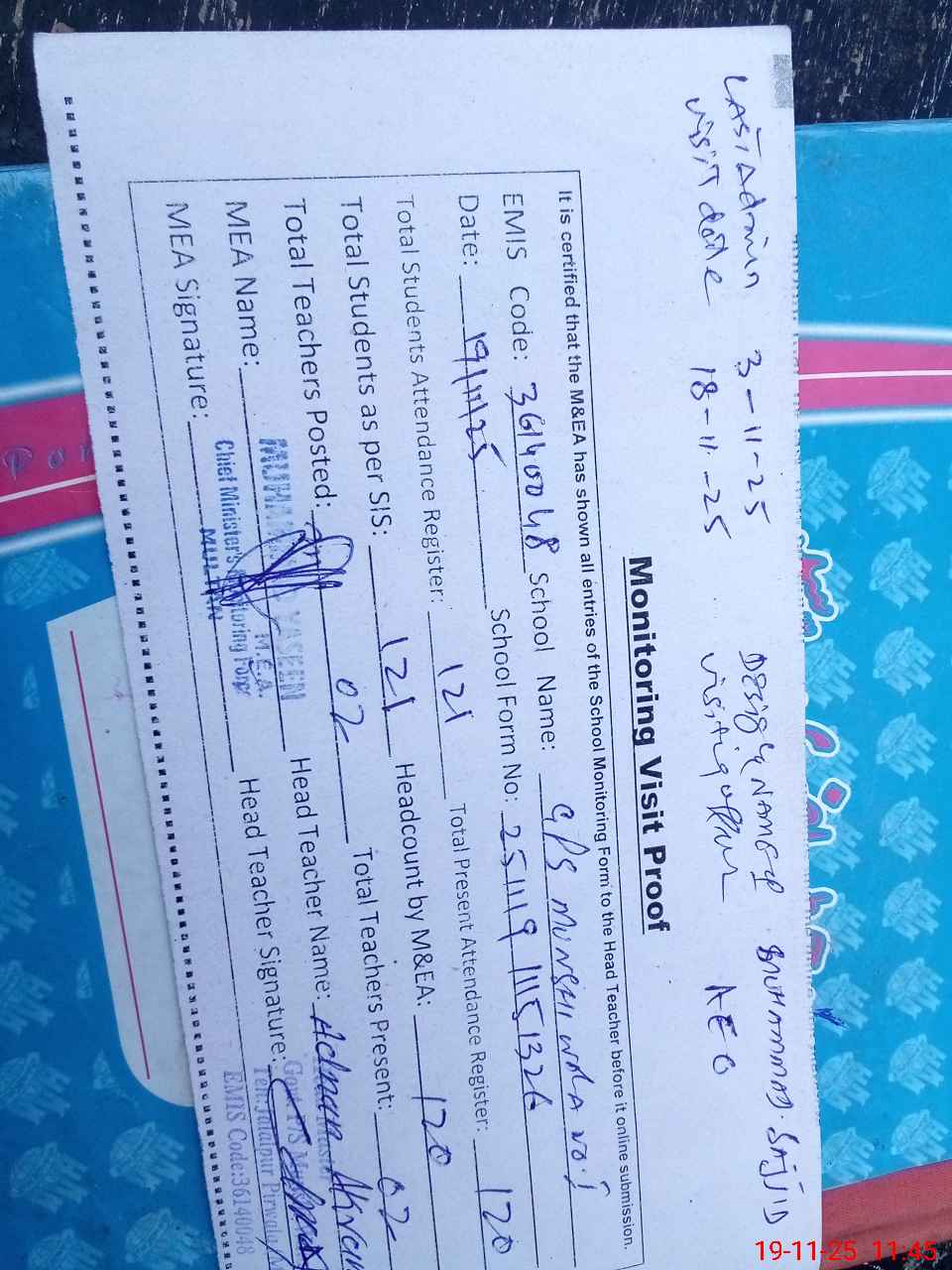 | Attendance Register | Head Teacher | MEA with School | Visit Proof |